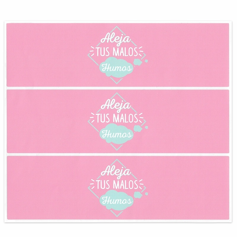Blister of 3 stickers keeps away your bad fumes, 6.6 x 23 cm, in 4 colors to choose from: yellow, blue, mint and pink. They are ideal for scented candles, especially for making anti-smoking candles. They will be perfect in the candle cans that you can also buy in Gran Velada. The stickers that you can buy in Gran Velada stand out for their resistance and quality. They adhere perfectly on different types of surfaces (cardboard, paper, plastic, glass, aluminum...) and are water resistant. Get these stickers and get a perfect packaging for your candles!