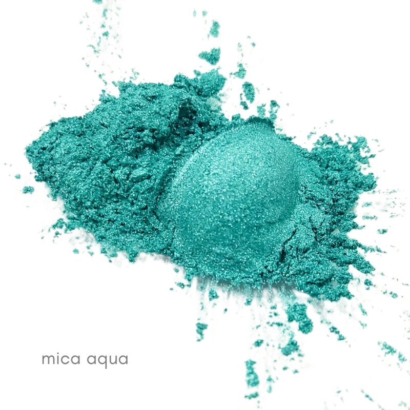 Mica Aqua is a pearlescent pigment that adds a blue-green hue to formulations. It is stable against light and pH, maintaining its color in gels, antibacterial gel, and clear soaps.
