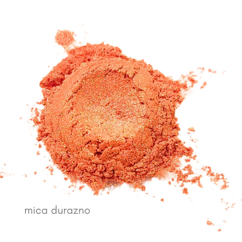 Peach mica is a pigment with a warm, pearlescent undertone, ideal for creating products with a delicate and attractive appearance. It works well in soaps, creams, and glosses for those seeking soft tones.