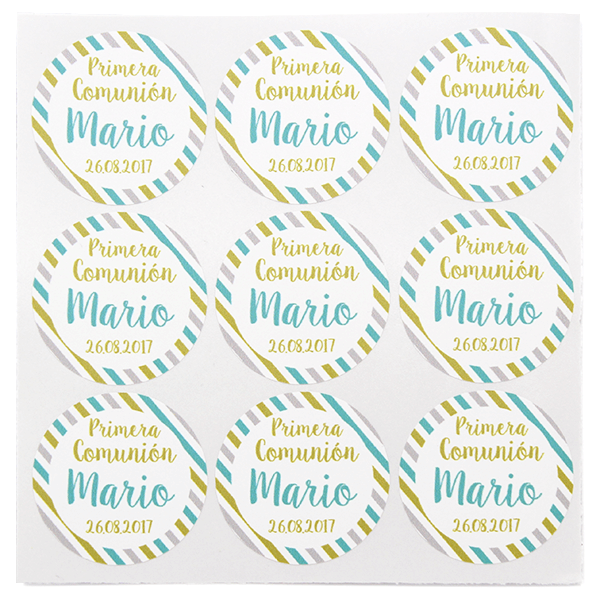 The design of these custom round stickers is simple and elegant. In the center of the sticker the name, in the upper area the event and below the date. Surrounding the text, small stripes of color that give it a touch of eye-catching.