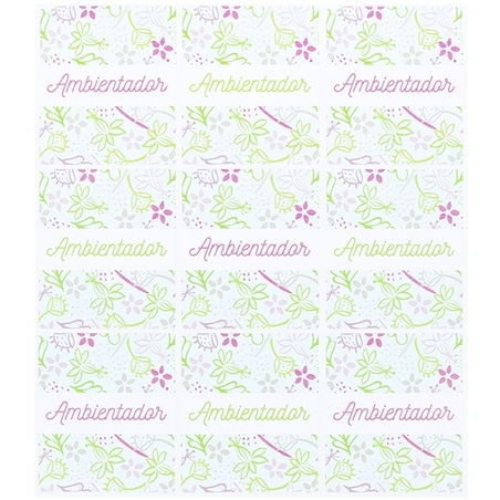 Blister of 9 flowered stickers , 5x4.3 cm, ideal for mini jars. They have a colorful floral print, in which green and fuchsia tones predominate. They are stickers with a white background, printed on plastic paper, and with the text "air freshener", in capital letters, in the center of the image. They are ideal to place in the mini bottles that you will find in our online store and use as a flavoring. With these flowered stickers, your mini jars will have a colorful and fun touch. They are perfect to complete your wedding details. These are quality and resistant stickers, which are sold in blisters, with discounts for quantity. Process your order online and you will receive them in just a few days.