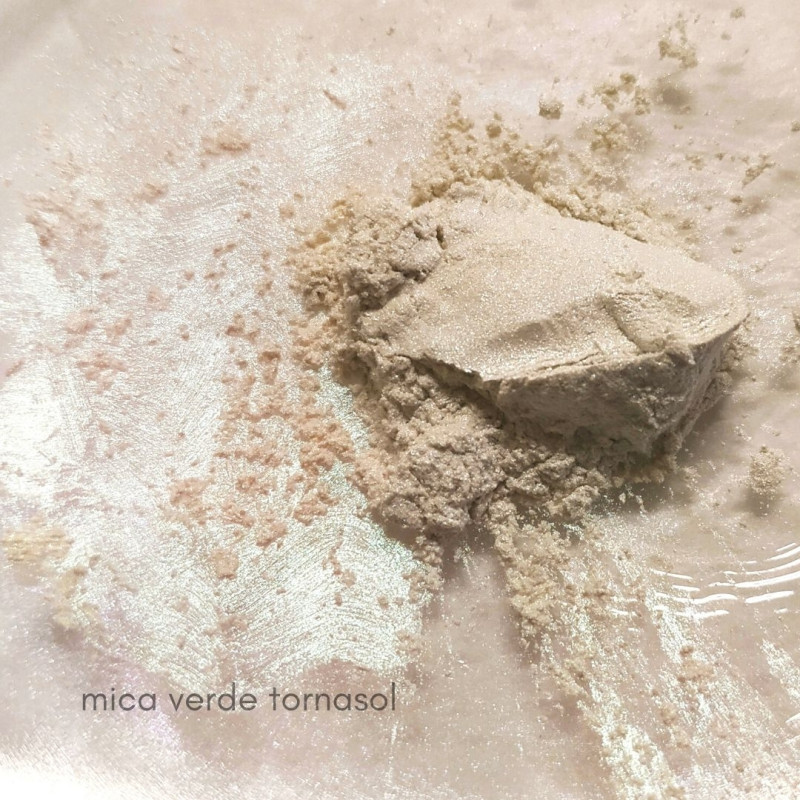 Mica verde tornasol aporta un efecto irisado que varía con la luz, generando acabados únicos y llamativos. Es excelente para productos artísticos y colecciones de edición limitada.