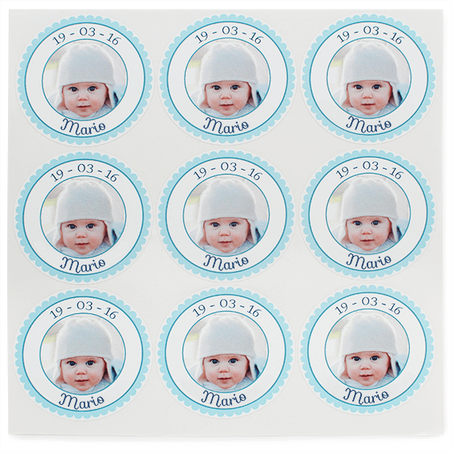 Paquete de 28 stickers personalizadas con foto, de 5 cm de diámetro. Este producto es ideal para aquellos que buscan una presentación única y distintiva. Las stickers son elaboradas con la imagen que nos envíes por correo electrónico, junto con el nombre y la fecha que desees incluir.